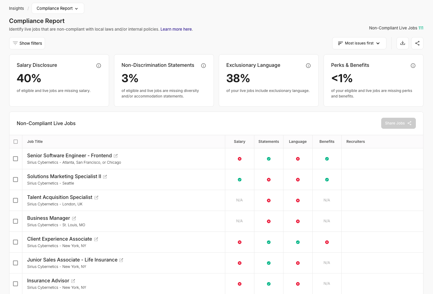 The Compliance Report is your single source of truth when it comes to surfacing non-compliant jobs, giving you and your team the intelligence you need to quickly and easily make changes where they will most impact your recruiting and compliance efforts.