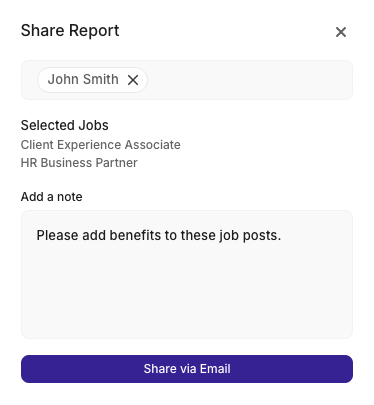 - Select a user to share the job(s) with and add an optional message. The selected user(s) will receive an email linking directly to the selected job(s):