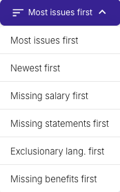 5. It's sortable: Jobs in the report are sorted by "Most Issues First" by default. Use the button at the top right to change this to Newest First, or to sort by issue type (salary, diversity statement, or accommodation statement).