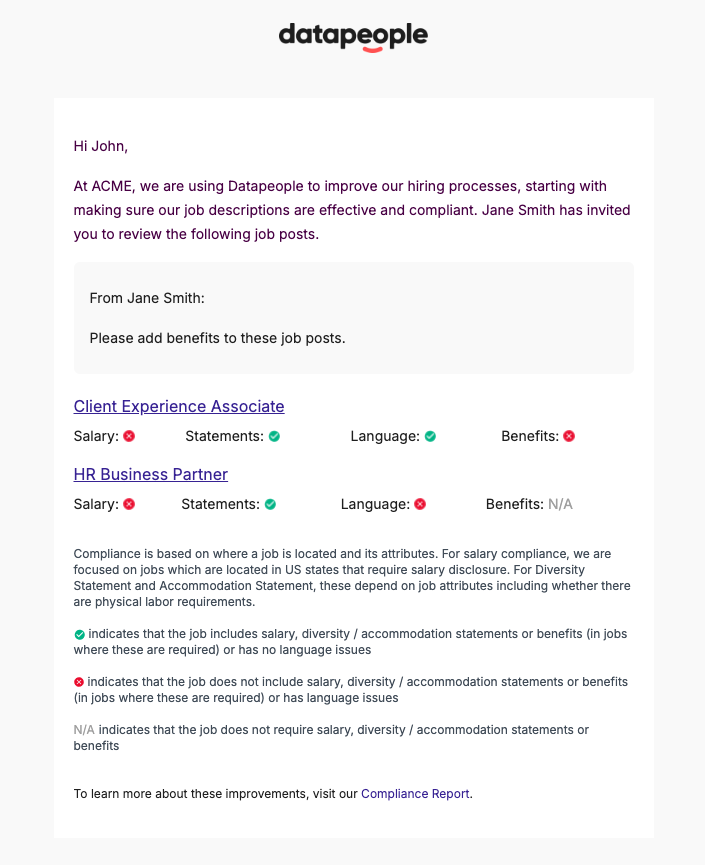 1. It's updated in real time: Unlike some of our other reports that require pulling information from your ATS, the Compliance Report is based on the content of the job description alone. This means once a job has been updated to include the missing content, it will be removed from this list.
