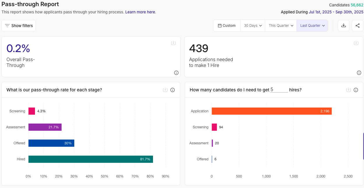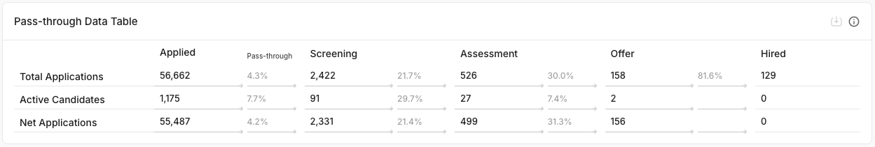 If you don’t see the Pass-through Report, it’s likely because your ATS isn’t integrated with Datapeople. Reach out to your Customer Success Manager to learn more about integrating, which allows deeper insights into your recruiting data via this and other Reports.