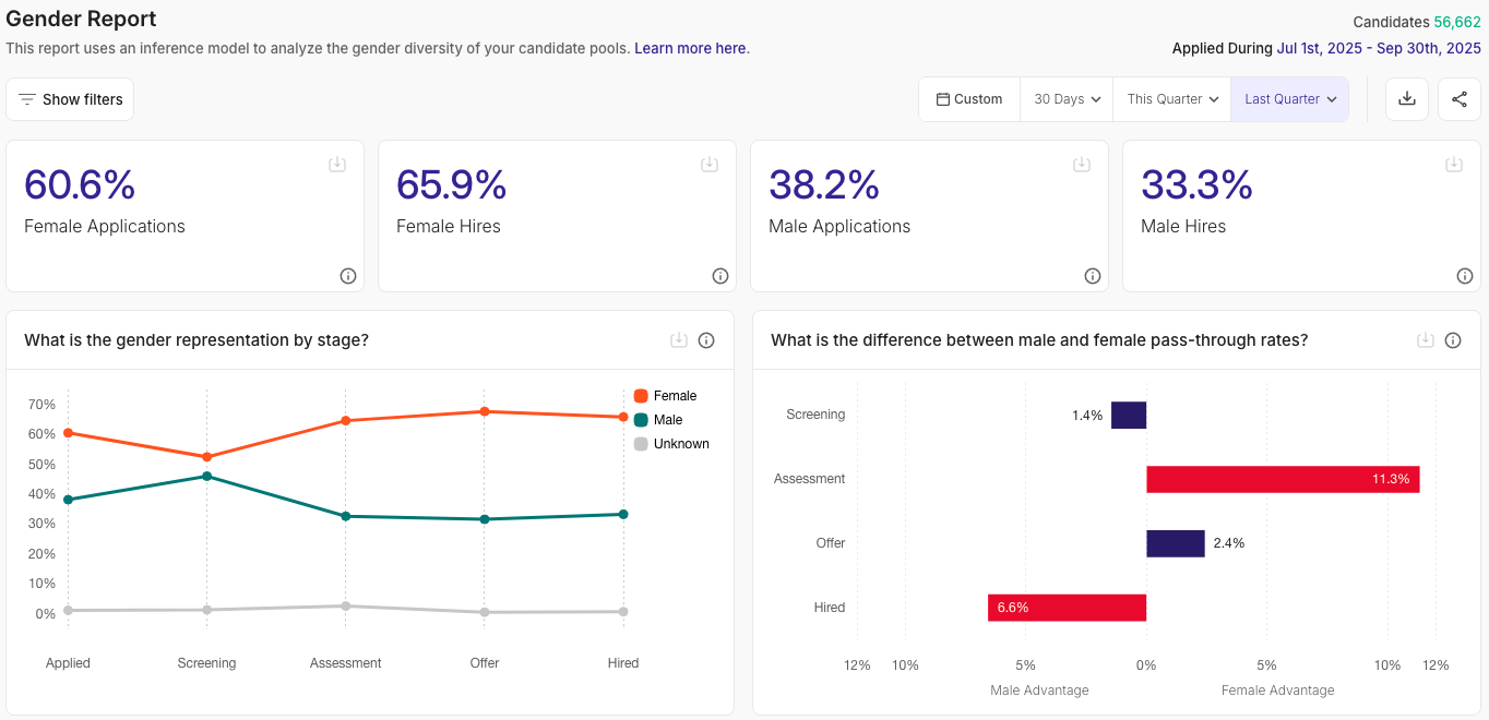 If you don’t see the Gender Report, it’s likely because your ATS isn’t integrated with Datapeople. Reach out to your Customer Success Manager to learn more about integrating, which allows deeper insights into your recruiting data via this and other Reports.