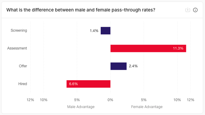 The bar graph on the right-hand side will show whether one gender category is advancing at a higher rate at each stage. For example, in the graph below, male candidates are advancing at a significantly higher rate in the Hired stage, while female candidates are advancing at a slightly higher rate in the Screening, Assessment, and Offer stages:
