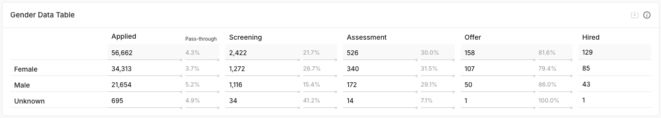 Hovering over points on the line graph will show the gender breakdown of the applicant pool at each stage in your hiring process:
