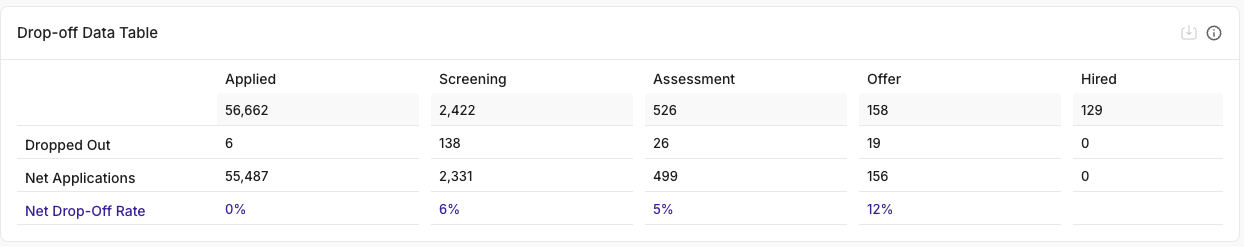 Net Drop-off Rate refers to the proportion of resolved candidates who dropped out at a given stage. This is also shown in the first graph. Active candidates are not included in this calculation. Learn why here.