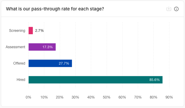 NOTE: Pass-through rates are expected to increase at each stage, since the number of candidates at each stage is ideally decreasing as you get closer to a decision. While a very high pass-through rate at the beginning stages may flag inefficiency, a high pass-through rate between the Offer and Hires stages is deal, as this is the equivalent to your Offer Acceptance Rate, which ideally would be close to 100%.