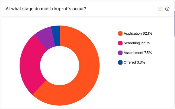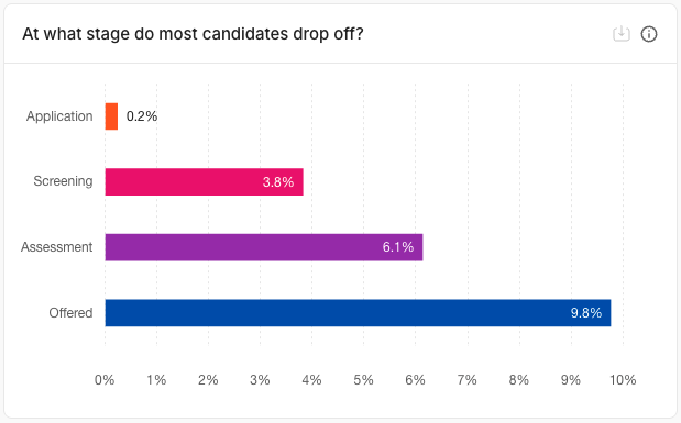 For example, if you have 2,854 candidates who dropped out of your process and 214 of them dropped out during the Assessment stage, we would divide those 214 candidates by the 2,854 total candidates who dropped out of the process, telling us that 7.5% of your drop-offs occur at the screening stage.