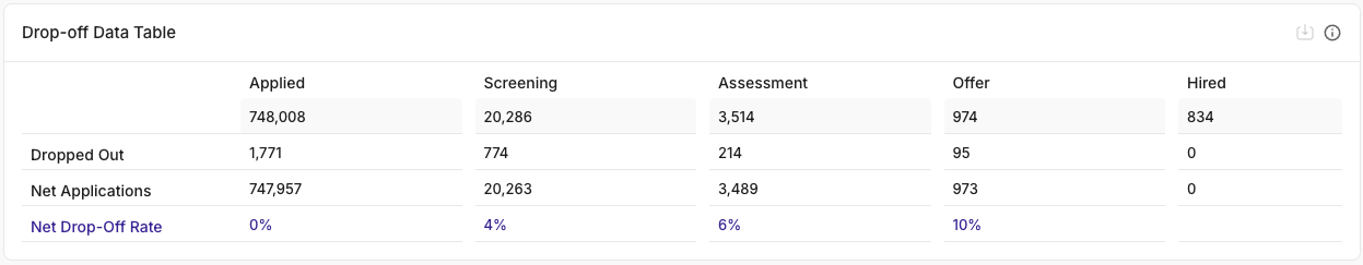 We look at where the highest number of drop-offs is occurring as a ratio of the number of candidates who advanced to the given stage and then dropped out divided by the total number of candidates who dropped out at any stage (total number of drop offs). This calculation does not take into account the candidate pool size at each stage, but rather focuses on where the largest number of drop-offs are occurring.