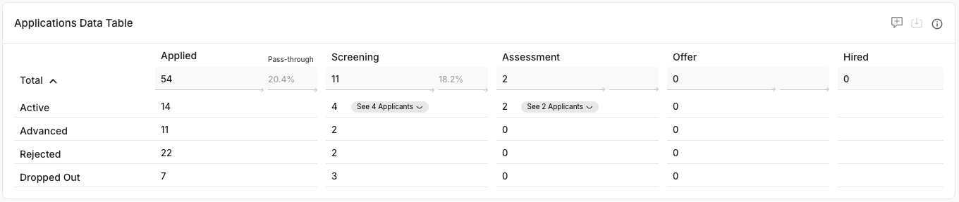 A warning on the data table flags that there are candidates in your process that are not being reflected in the data table because there has been a delay in their stage mapping in our system. This should resolve itself in 24 hours, but please contact your customer success rep if that is not the case.