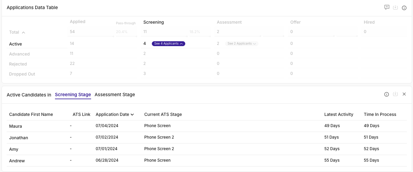 The table allows you to view all active candidates in each stage and how long they have been in that stage.