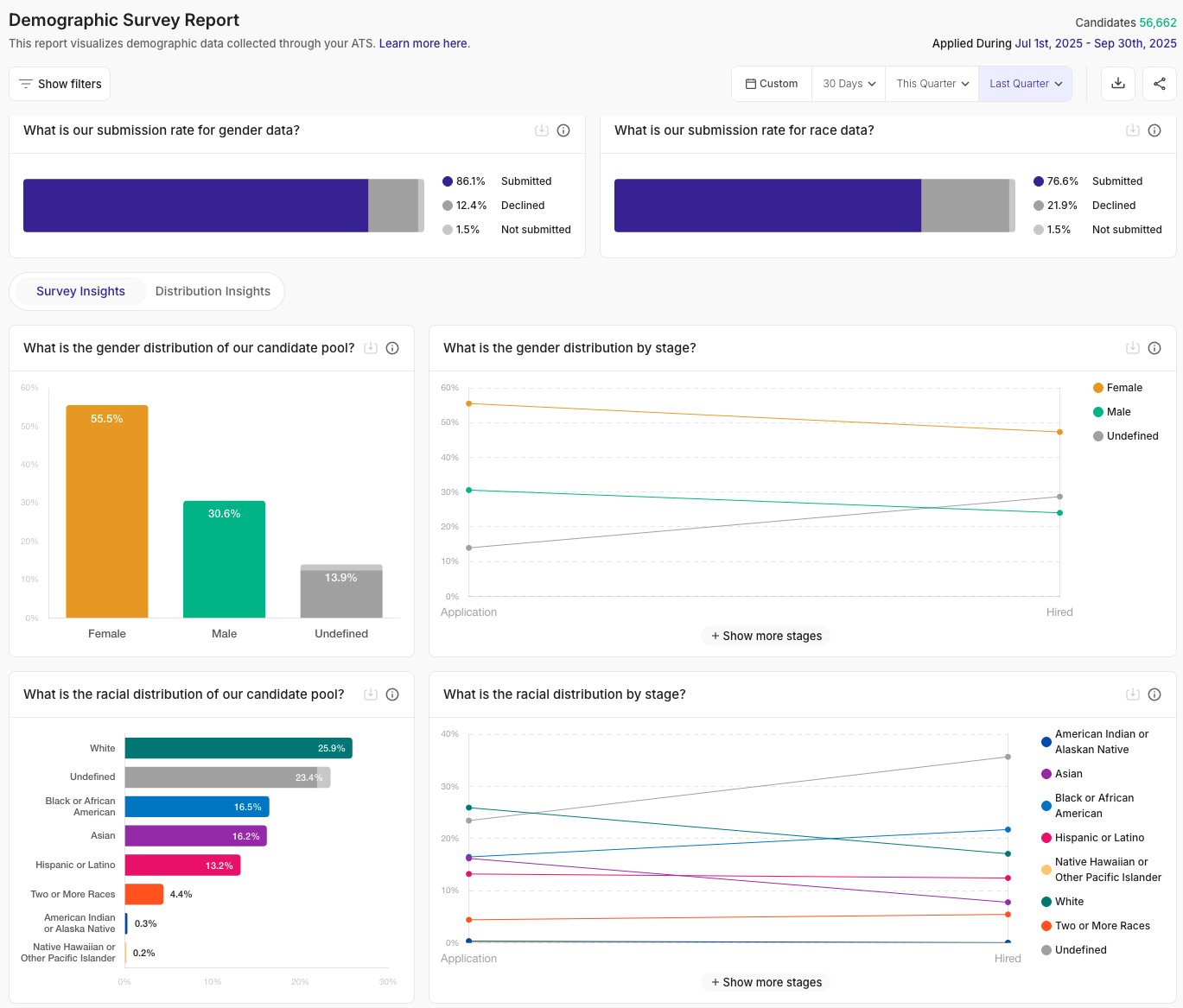 With a high survey submission rate, you'll be able to view the Survey Insights tab where you can see the gender and racial distribution of candidates throughout your recruiting process.