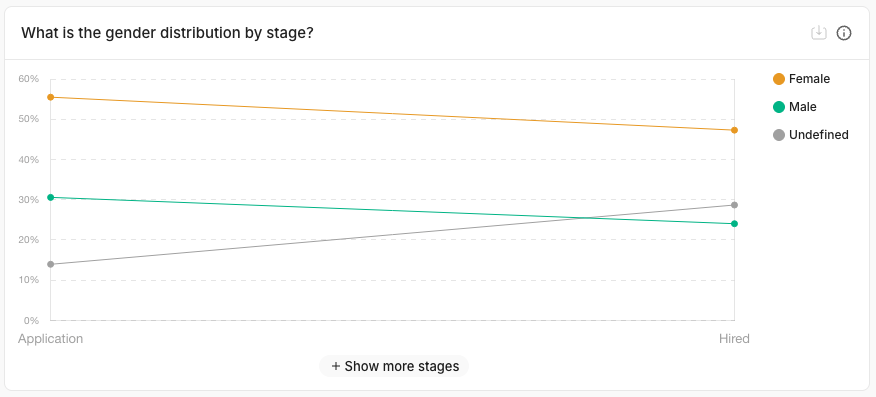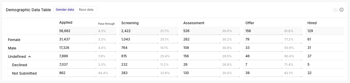 Datapeople's Demographic Survey Report, part of our Process Insights, tracks candidate-reported gender and racial representation to ensure your hiring process is equitable at every stage.
