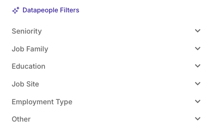Some filters are created by Datapeople, based on our analysis of your jobs. These filters help you compare your jobs based on similarities like job type or experience level at a high level that may not be easily available in your ATS filters.